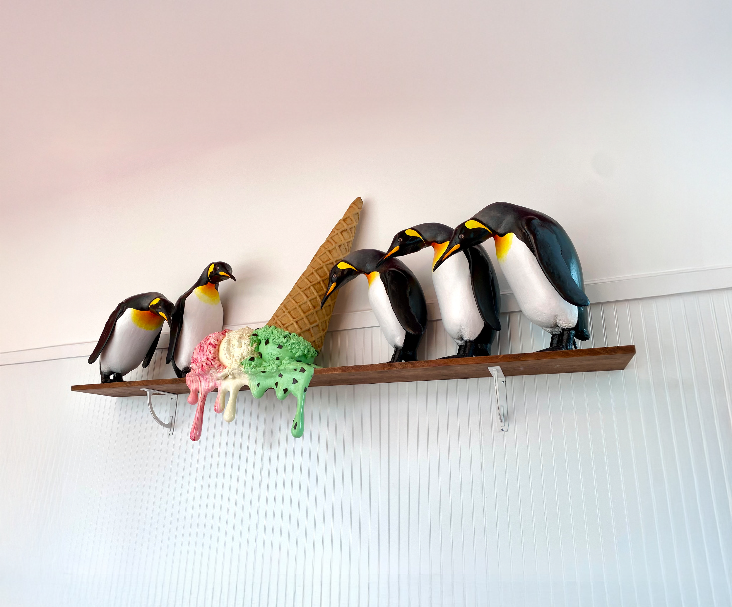 This piece features a raft of Emperor penguins gathered around a toppled waffle cone and three scoops of ice cream. Blending whimsy with urgency, the piece draws a visual parallel between a vanishing treat and the melting polar ice caps. “Having a Meltdown” invites reflection on climate change and its impact on fragile ecosystems, while offering a memorable, site-specific experience for guests of all ages.